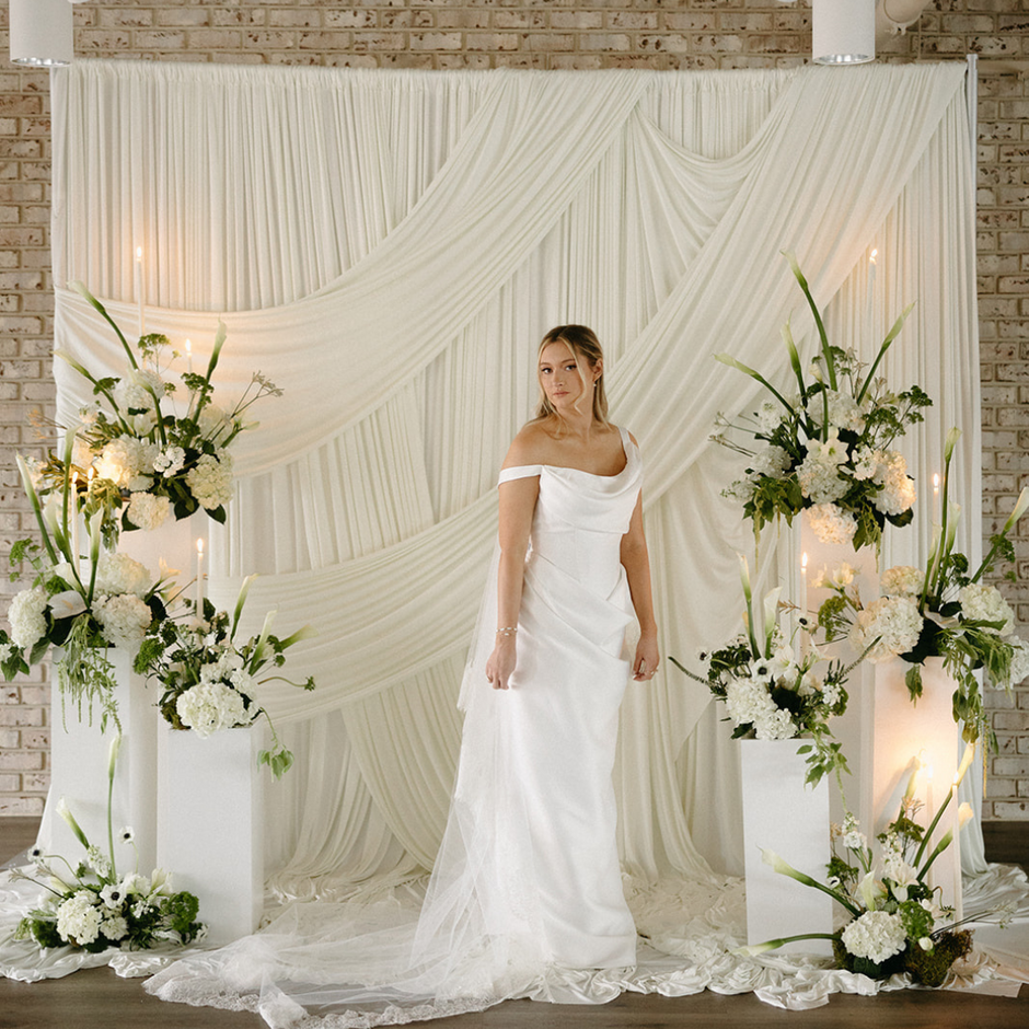 Elegant, sweeping draping that redefines the room, from dramatic ceiling installations to soft, sculptural backdrops.